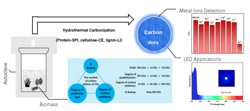 磷化工团队以纯纤维素、木质素和大豆分离蛋白为原料,通过水热法制备了三种碳点,揭示了碳点不同理化性质背后的机理。由于成分的差别和在碳化过程中演变过程的差异,导致生物质基碳点荧光的差异性。在碳化过程中氨基酸大分子结构的保留带来的N掺杂、更规整的晶格结构和更大的sp2结构域,都是导致碳点荧光的增强的关键因素。本研究首次揭示了生物质不同组分在碳化过程中的结构演变及其带来的荧光性能差异,指出在生物质碳点的制备过程中,应当标明生物质的组分分率。本研究最终制备的大豆分离蛋白碳点还在离子检测和LED照明领域表现出不错的应用前景。