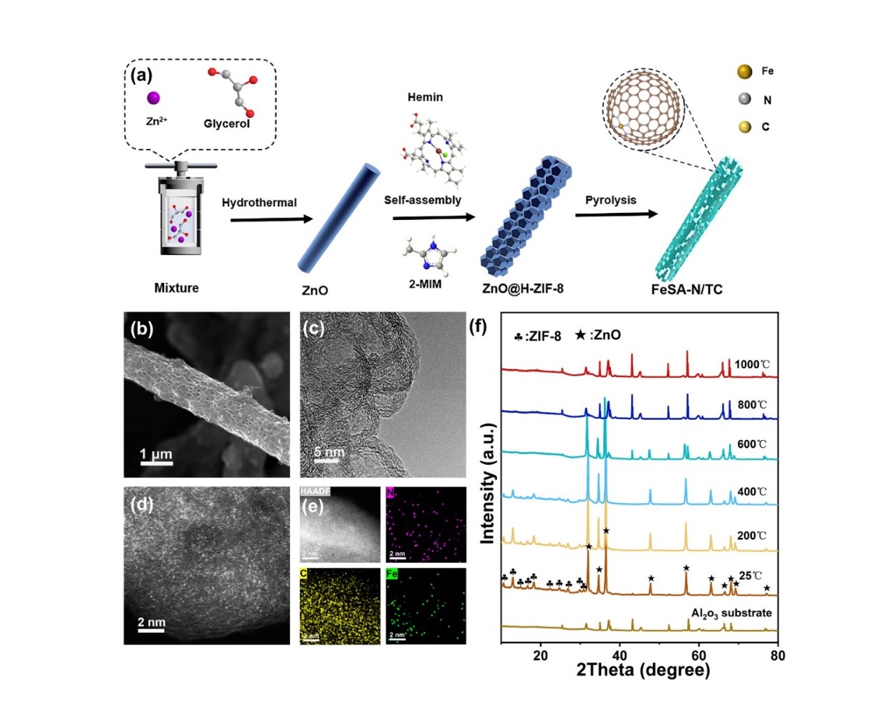 单原子Fe-N/C材料是当前最有前景的非贵金属燃料电池催化剂,其活性位点为平面Fe-N4配位结构。金属有机框架ZIF-8材料的配位结构与Fe-N/C的活性位点高度相似,因此被认为是合成高活性Fe-N/C材料的最有效前驱体。然而,目前ZIF-8衍生的Fe-N/C催化剂主要为微孔材料,导致其在燃料电池中的传质受到限制,从而影响了电池性能。此外,平面Fe-N4配位结构的本征活性仍需进一步提升。为此,我们提出了一种ZnO辅助策略,通过棒状ZnO水解产生的Zn2+与2-甲基咪唑之间的自组装反应,制备氯化血红素修饰的ZIF-8薄膜,随后通过热解获得中空管状Fe-N/C材料(FeSA-N/TC)。该材料的管壁富含层次介孔和微孔,且Fe-N4活性位点被锚定在小尺寸的纳米孔内部,形成弯曲应力,从而提升其本征催化活性。因此,FeSA-N/TC在氧还原反应中表现出优异的性能,在碱性条件下半波电位可达0.925 V,在酸性介质中可达0.825 V。作为阴极催化剂应用于质子交换膜燃料电池(PEMFC)和锌空气电池(ZAB),其电池功率密度也表现出极高的值(氢氧PEMFC:1100 mW cm-2,氢空气PEMFC:715 mW cm-2,液态ZAB:228 mW cm-2,固态ZAB:112 mW cm-2)。此外,利用原位变温高能XRD和DFT理论计算揭示了催化剂的合成机制及其电催化氧还原反应的机理。本研究为能源器件中高性能催化剂的设计、制备及其催化机制的研究提供了新的指导。