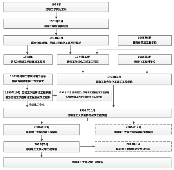 1994年,云南化工专科学校并入云南工学院化工轻工工程系,成立云南工业大学化工轻工工程学院。